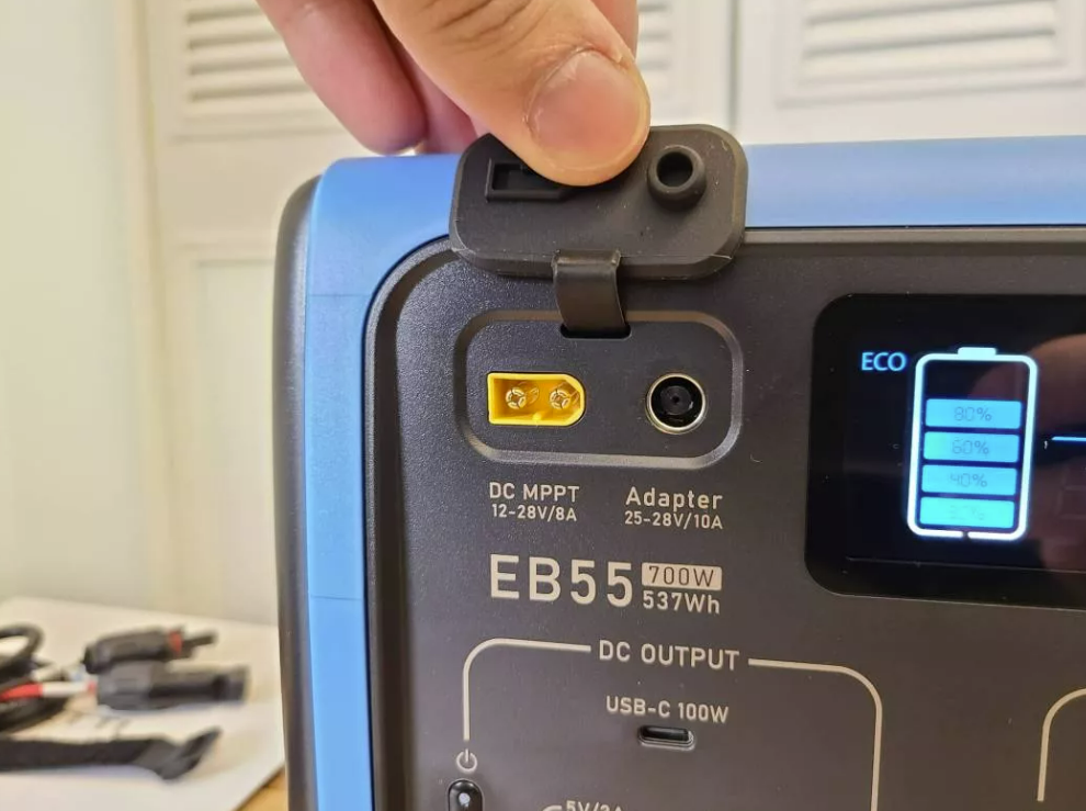 Las otras dos opciones que puedes utilizar para recargar la central eléctrica EB55 son un panel solar o el cable de carga para coche incluido; En la caja se incluye un conector de cable de carga solar que conectaría a un panel solar.